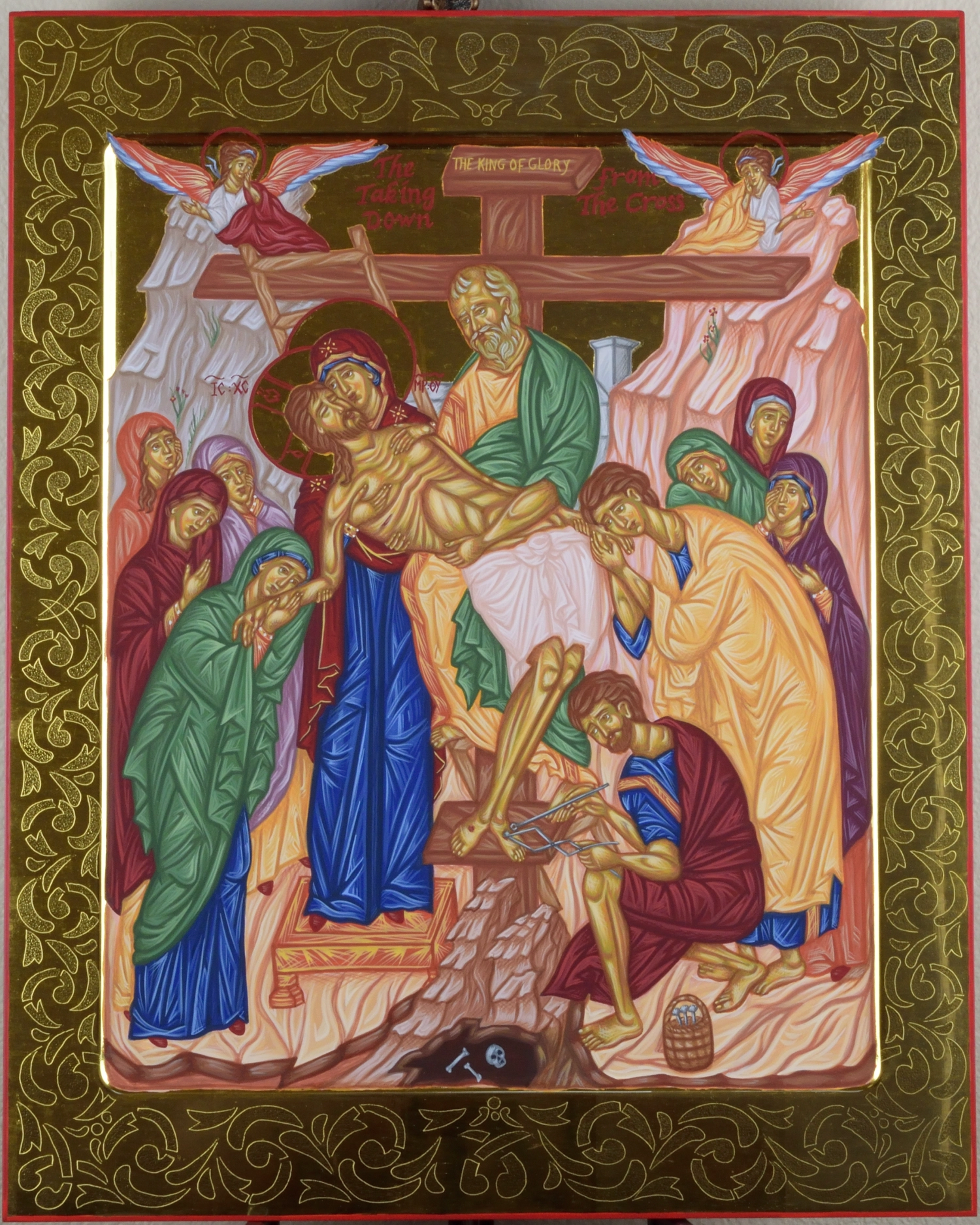 ثالثا في كتابات الآباء واخص منهم القديس افرام السرياني الذي يقول ان اعظم شيء عمله يسوع انه اعطانا جسده لنأكله وهو بعد حي بروحه البشرية وبكامل الوهيته. ويضيف ان المسيح ركب على الصليب ليشدد على انه صلب بإرادته. ولذلك نرسمه مرتاحا على الصليب وكأن الصليب عرشا له يبذل من فوقه جسده ذبيحة عنا. ولذلك لا نكتبه في الايقونة في كنيستنا الارثوذكسية مدندلاً هابطا معلقاً.