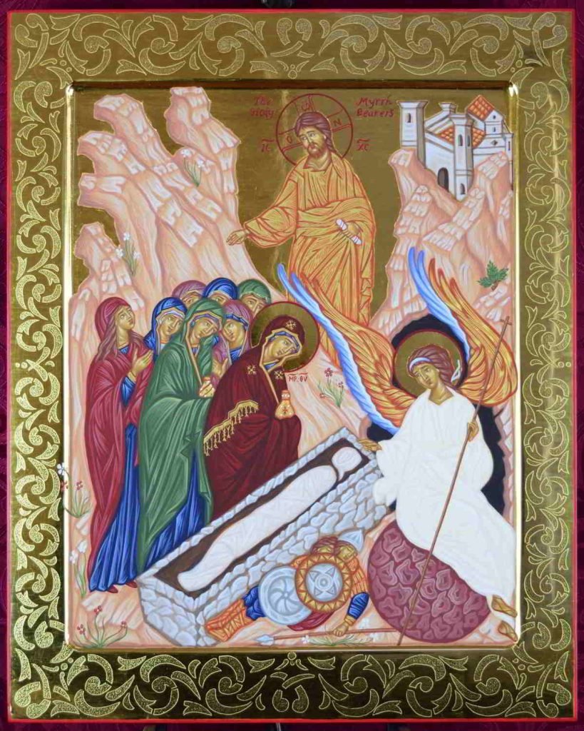 ولذلك نرى في ايقونة حاملات الطيب سبع نساء ووالدة الإله فوقهنََّ، نضيف اليهنََّ الرجُلين الذين كانا قد سبقا وحملا الطيوب عند الدفن.